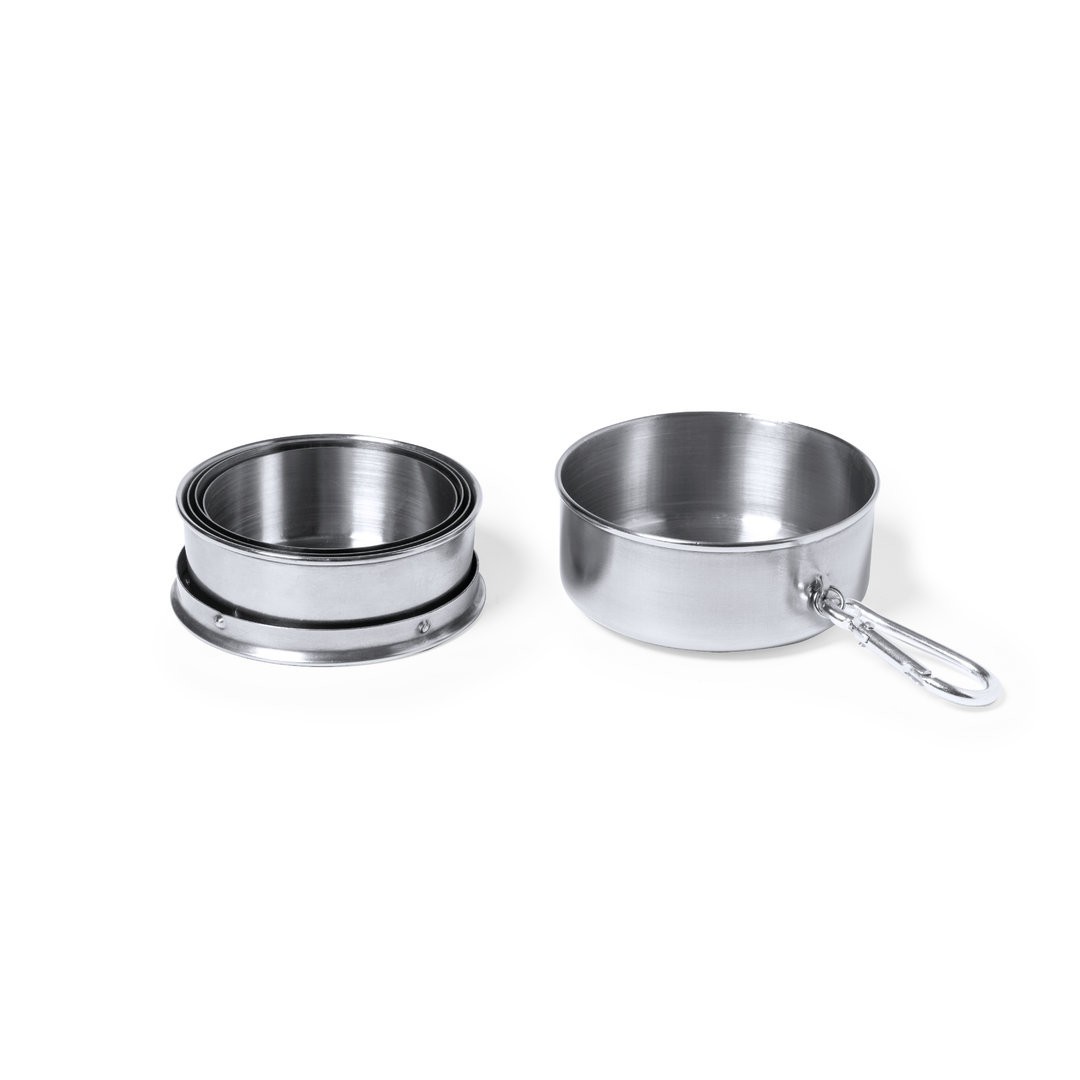 Original vaso plegable para emergencias fabricado en acero inox. De 220ml de capacidad y con mosquetón metálico de transporte.