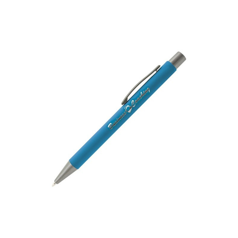 Bolígrafo puntero fabricado en aluminio. De mecanismo pulsador con puntero y clip metálico a juego con el cuerpo. Cuerpo terminación en goma, especialmente diseñado para marcaje en láser. De cartucho jumbo y en tinta azul.