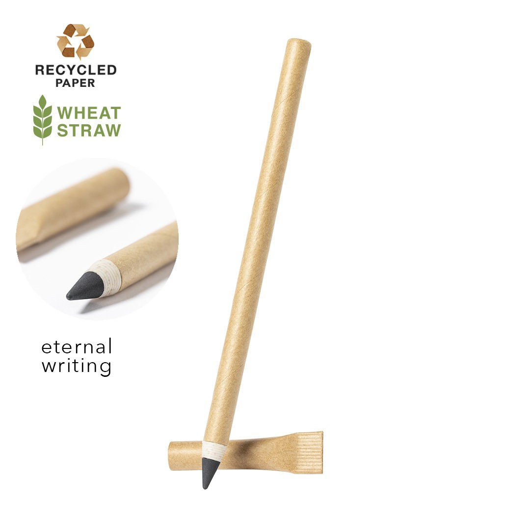 Lápiz eterno de línea nature con capucha. Fabricado en papel reciclado y con punta en caña de trigo, fomentando la utilización de materias primas naturales y reducir las emisiones contaminantes. Reutilizable y con escritura infinita, para así usar siempre el mismo lápiz y no generar residuos.