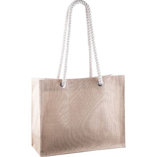 Bolsa fabricada en yute con asas de cordón largas y laminada en su interior.