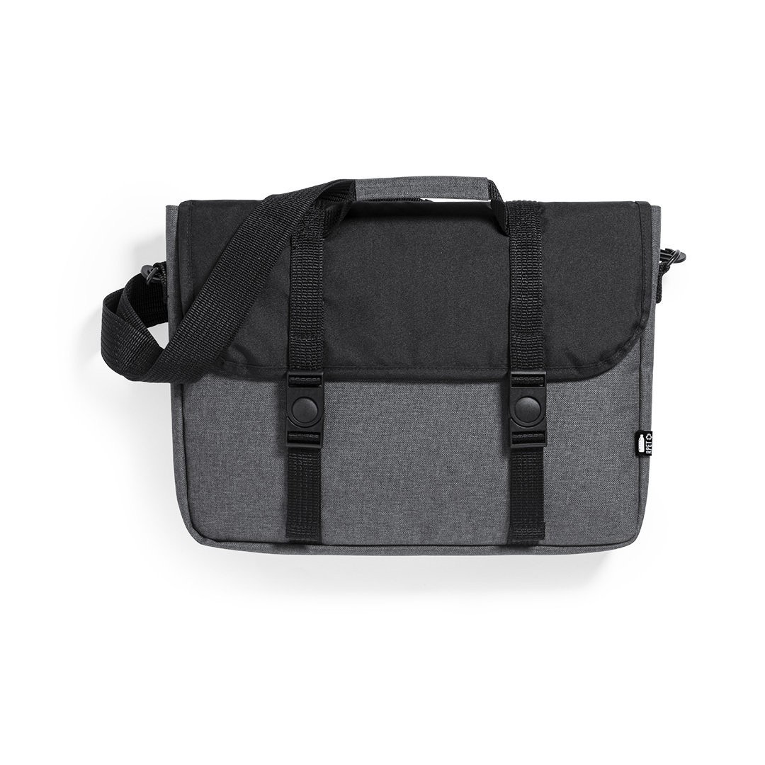 Portadocumentos de línea nature y en resistente poliéster 600D RPET reciclado y libre de PVC, fruto de la combinación del proceso de reciclaje de materiales plásticos junto con la técnica milenaria de fabricación del fieltro, dando como resultado un material de eco-tendencia de origen reciclado. Con acolchado y bolsillo principal con tiras de cierre de hebilla; bolsillo interior de cierre de cremallera y cinta bandolera ajustable para hombro. Con asa de transporte reforzada y accesorio en parte posterior para ajuste en barra de trollley. Resistencia hasta 7kg, con distintivo RPET en etiqueta exterior.
