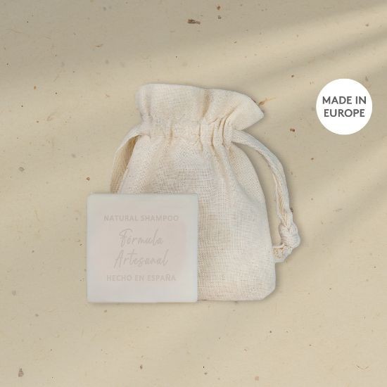 Champú vegetal sólido de 40 gr con perfume de jacinto presentado en bolsa de algodón. Hecho en Europa. Cada pastilla equivale a 125 ml de champú líquido.