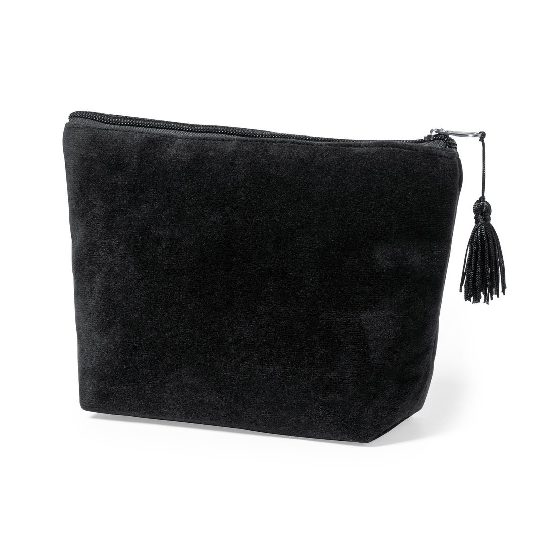 Neceser de tacto terciopelo, con cierre de cremallera y borla en tirador. Fabricado en terciopelo rayón y de acabado cosido, disponible en colores marrón y negro.