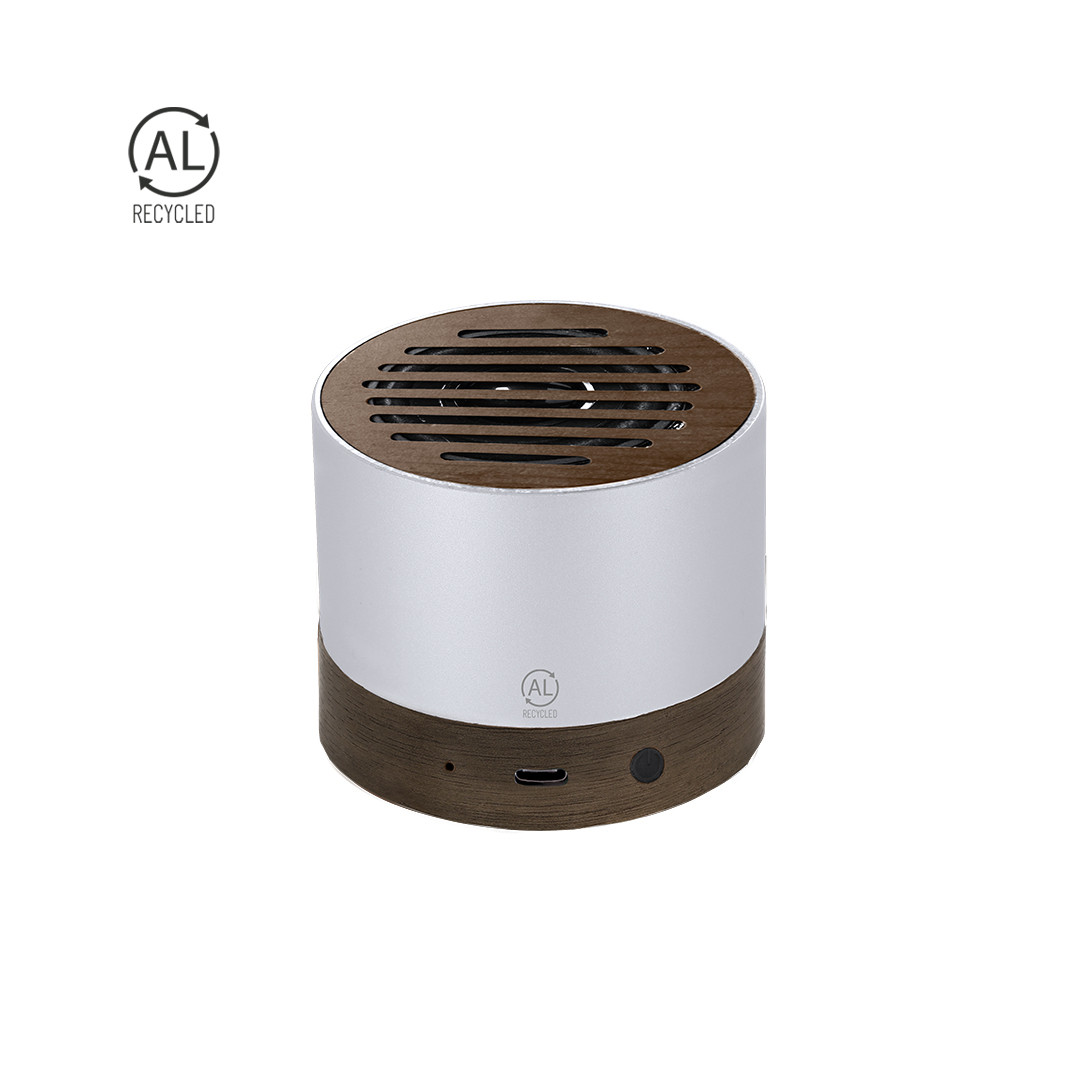 Altavoz fabricado en aluminio reciclado con madera de nogal. Con conexión Bluetooth® 5.3 y 3W de potencia. Incluye distintivo Aluminio Reciclado en carcasa.