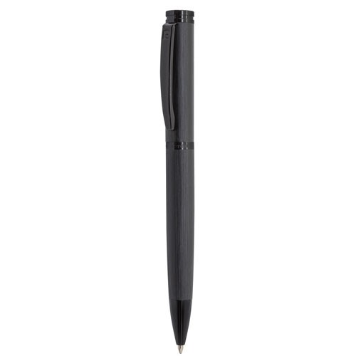 Bolígrafo metálico con textura de aluminio cepillado y apertura giratoria. Escritura Azul de tacto suave.