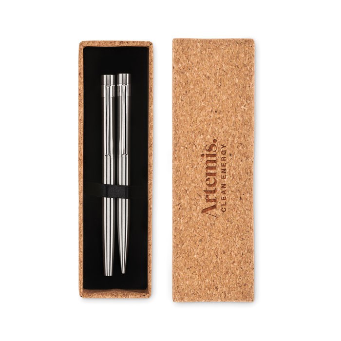 Set de bolígrafo y roller de acero inoxidable reciclado. Presentado en caja de corcho a juego. Tinta azul y negra respectivamente. El corcho es un material natural, debido a su naturaleza estructural y porosidad superficial, el resultado final de la impresión por artículo puede tener desviaciones.
