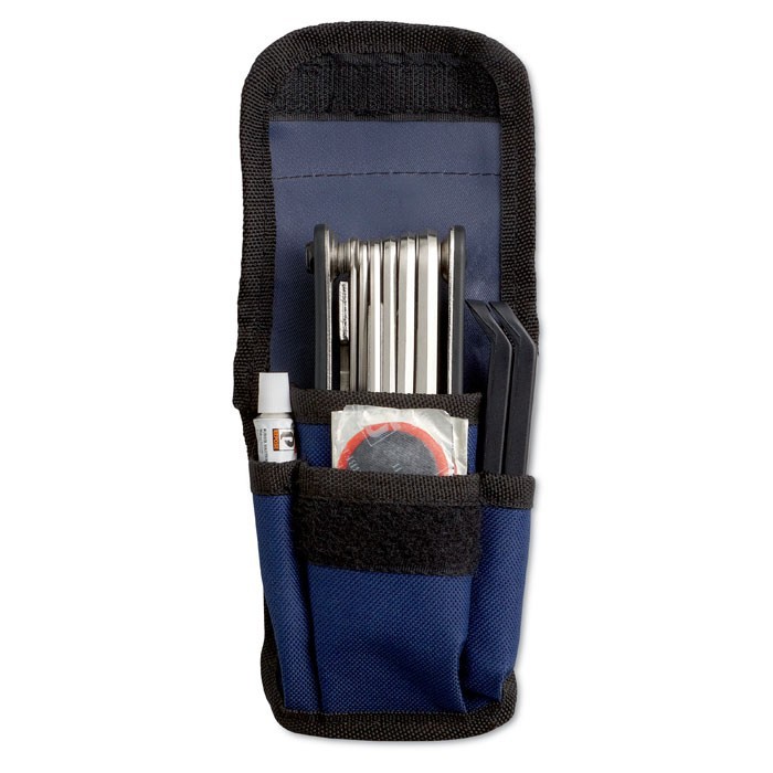 Kit de reparación de bicicletas. Set de 15 piezas con 2 palancas de neumáticos, una lija, pegamento y parches. Funda con banda reflectante en el exterior.