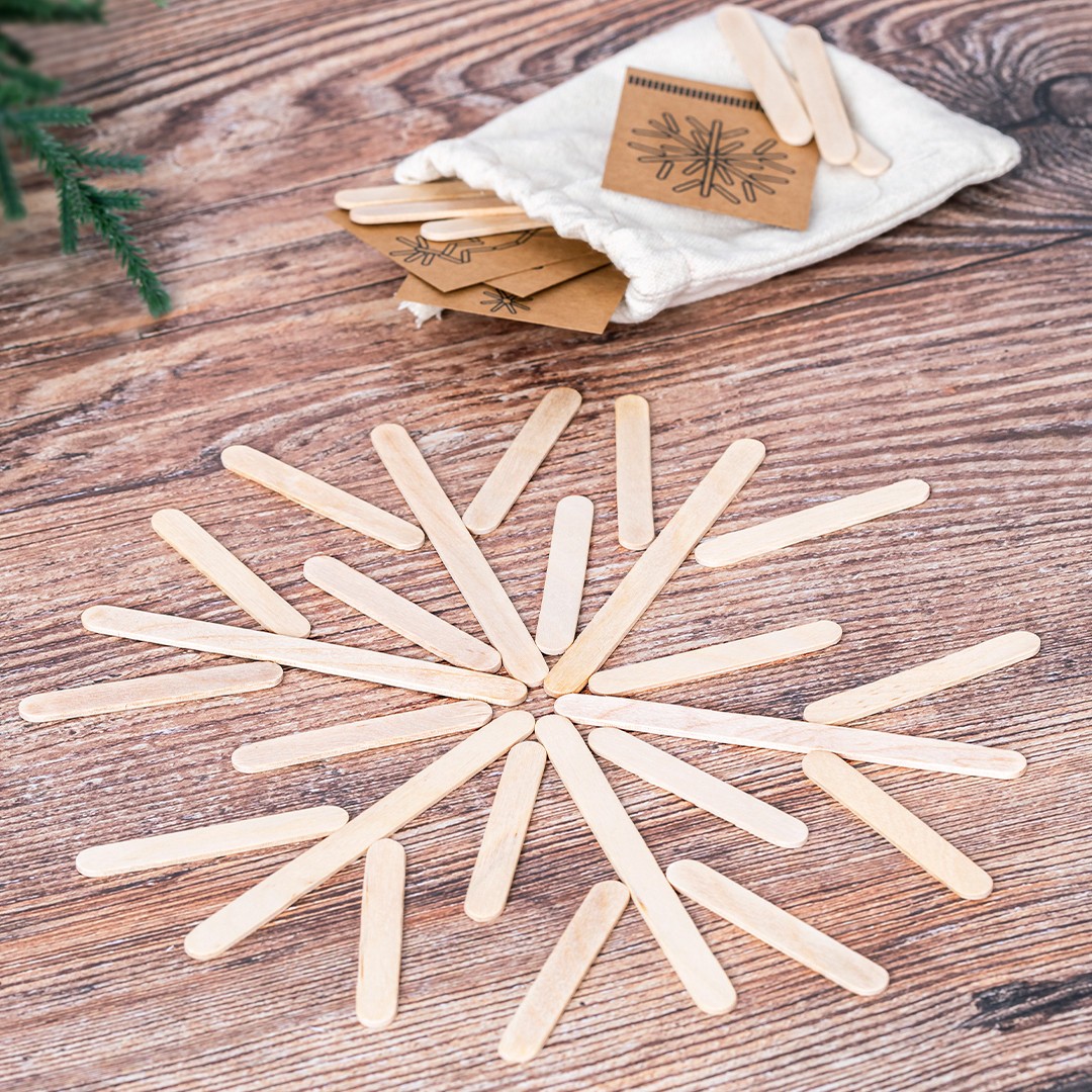 Incluye 36 piezas de madera natural en diferentes tamaños para construir las figuras(8 largas y 28 cortas) y 4 divertidos diseños de estrellas con tarjetas visuales en cartón reciclado. Presentado en bolsa 100% algodón.
