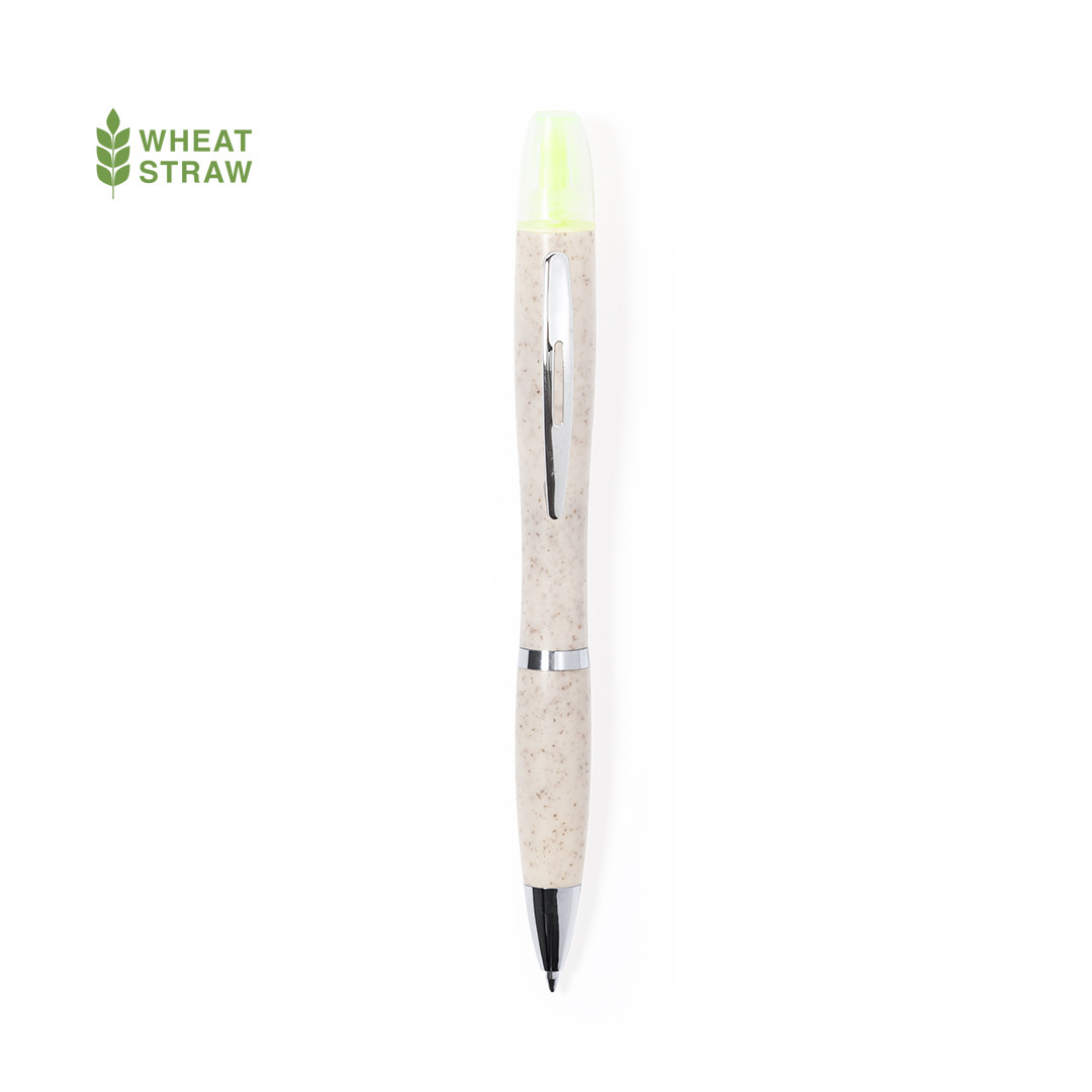 Práctico bolígrafo fabricado en caña de trigo y ABS con marcador incluido. De mecanismo giratorio y en tinta azul. En la parte superior incluye un útil marcador amarillo fluorescente con capucha. Logotipo Wheat Straw en la parte superior del bolígrafo, con clip y accesorios metálicos, y cuerpo color natural.