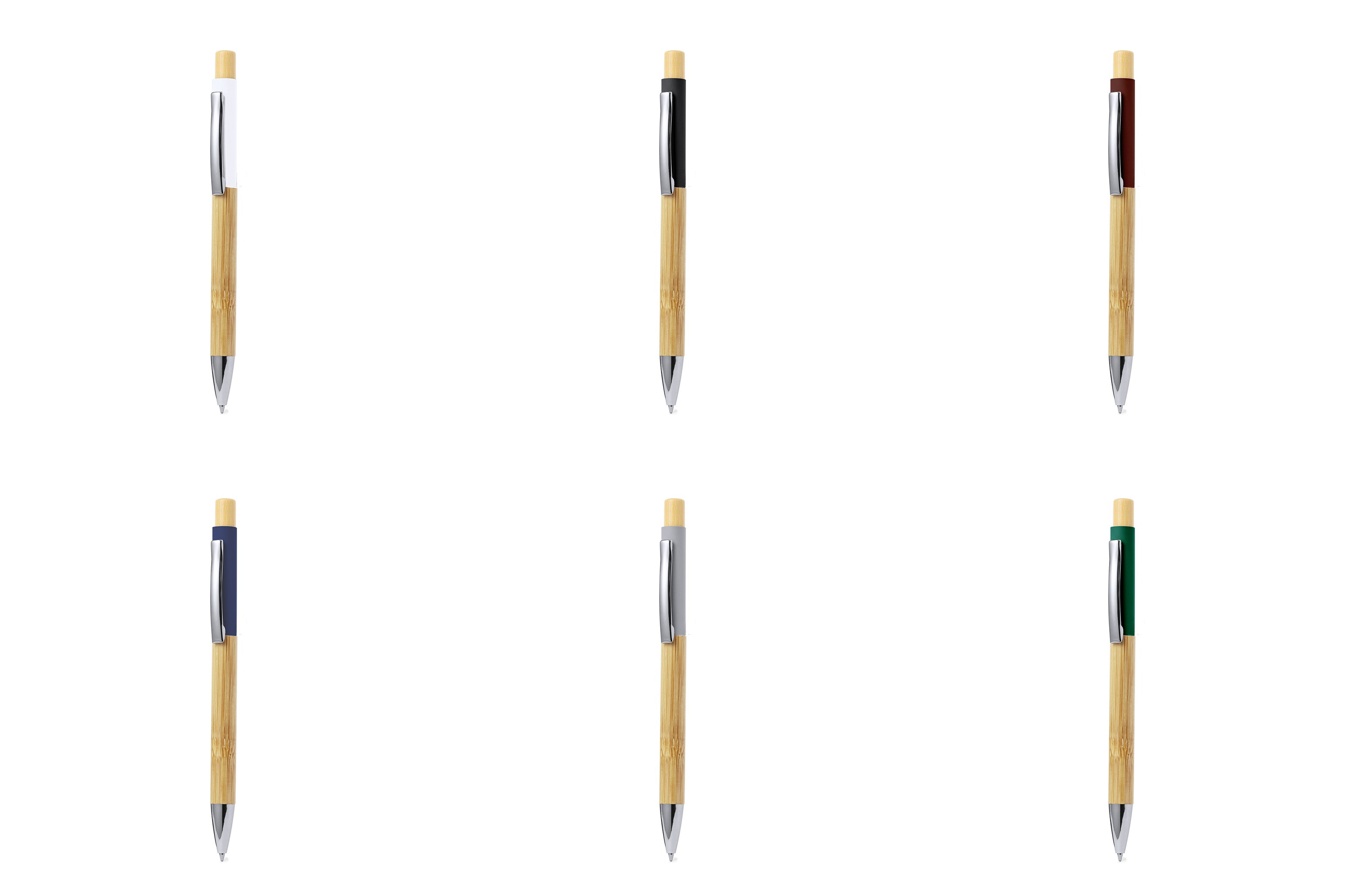 Elegante bolígrafo fabricado en bambú. Cuerpo en resistente aluminio de acabado goma y empuñadura en bambú, con la caña en una amplia gama de distintivos colores. Clip metálico, con mecanismo pulsador y en tinta azul. Presentado en bolsa individual reciclada.