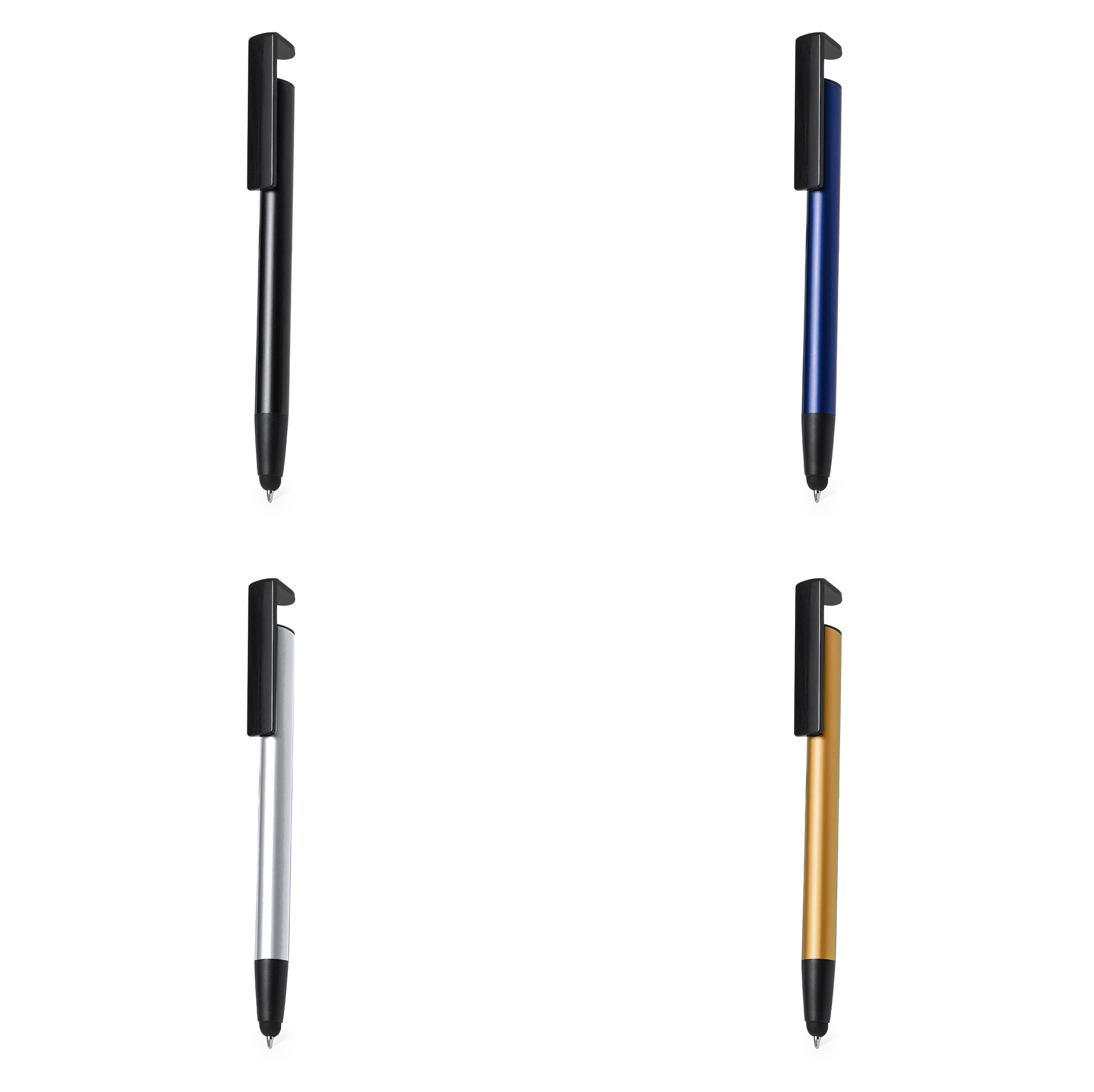 Bolígrafo puntero de mecanismo pulsador, fabricado en resistente aluminio. Con soporte para dispositivo móvil integrado en clip y suave cuerpo en variada gama de colores metalizados. En tinta azul y presentado individualmente en bolsa reciclada.