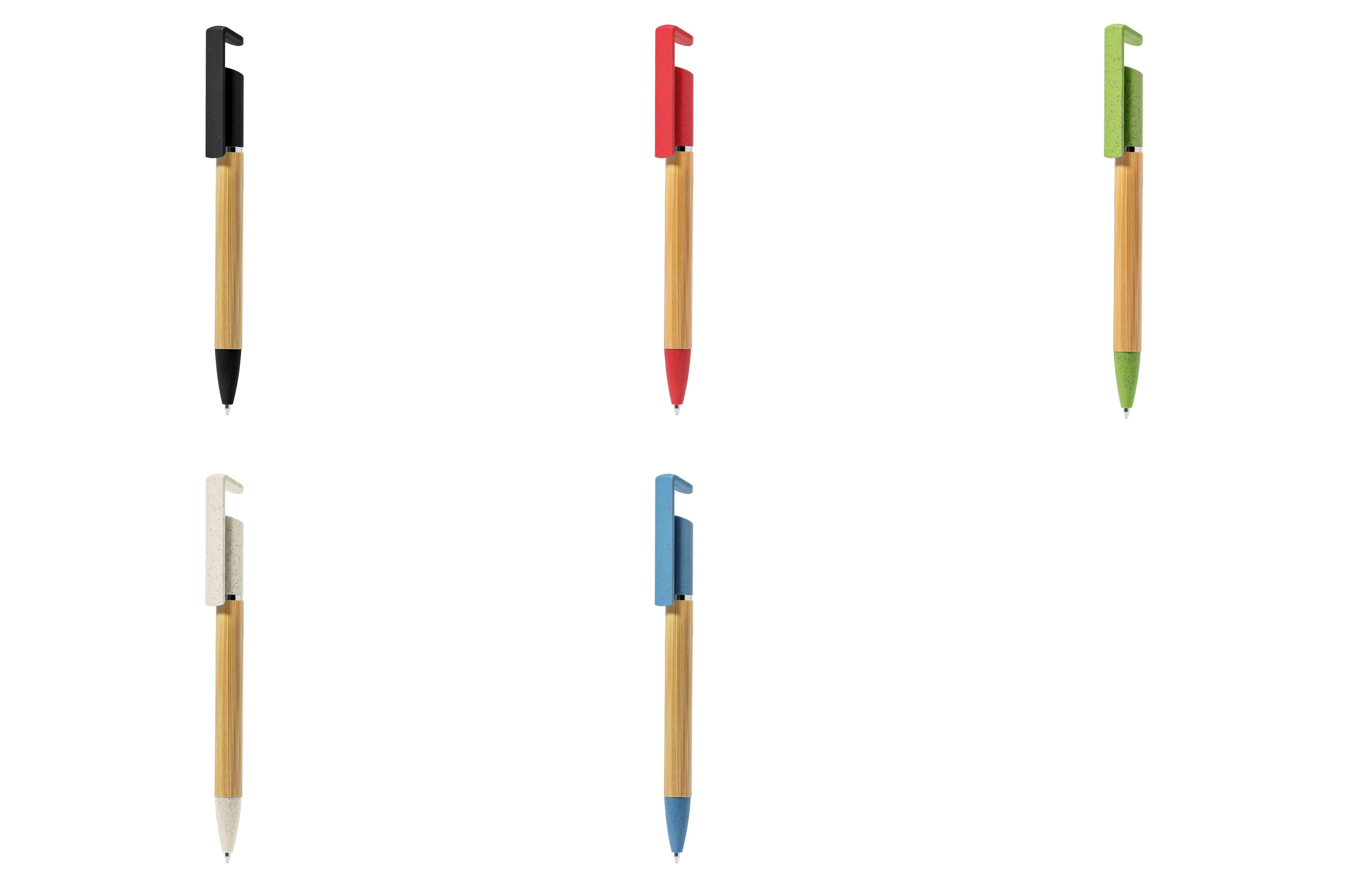 Práctico bolígrafo soporte fabricado en bambú y caña de trigo. Cuerpo en bambú, con accesorios en caña de trigo a color y elementos decorativos metálicos. De mecanismo giratorio, con soporte integrado en clip para dispositivo móvil. En tinta azul, con carga jumbo y disponible en variados colores.