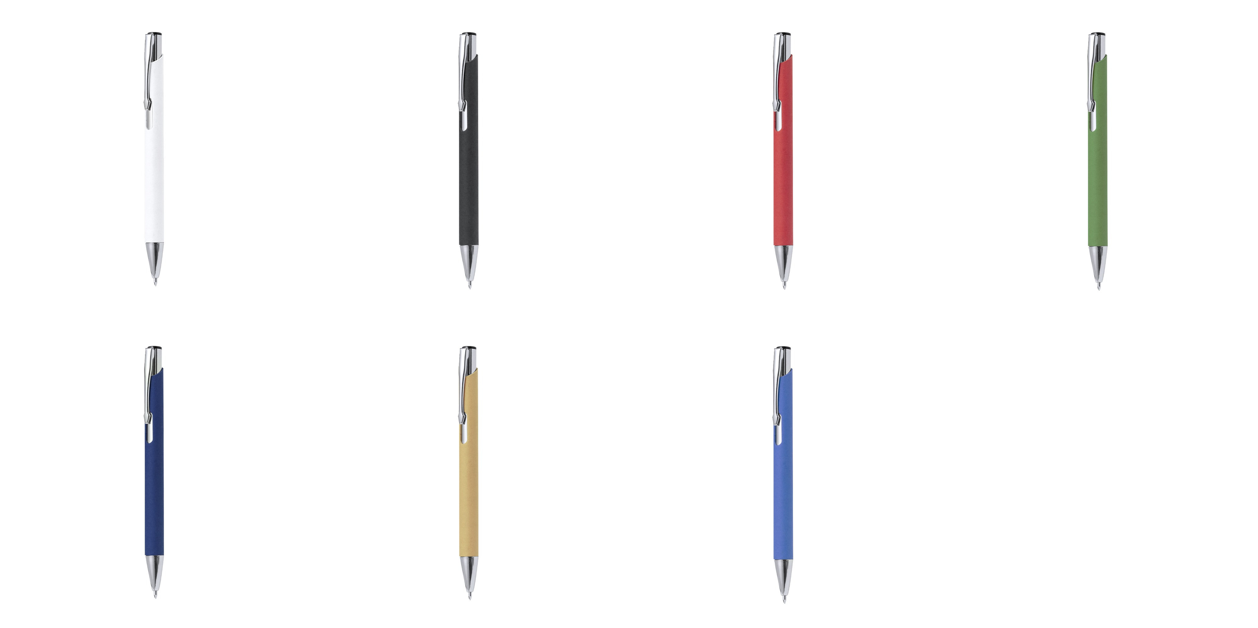 Bolígrafo de línea nature con mecanismo pulsador. Combinación de cuerpo en papel reciclado de color natural y accesorios en metal. Disponible en variada gama de colores, con tinta azul.