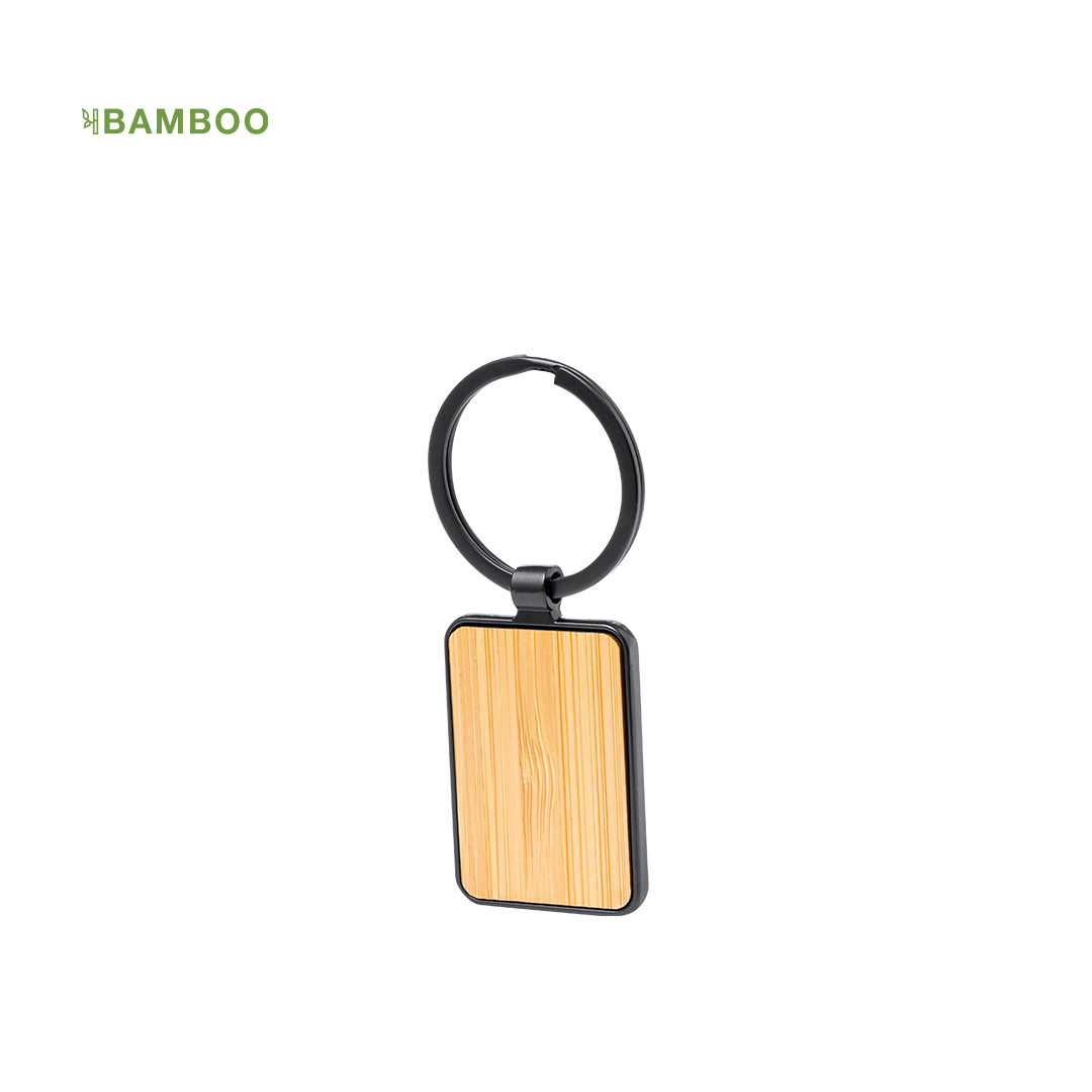 Llavero de elegante diseño, fabricado en metal pulido de color negro, con una cara en suave bambú.