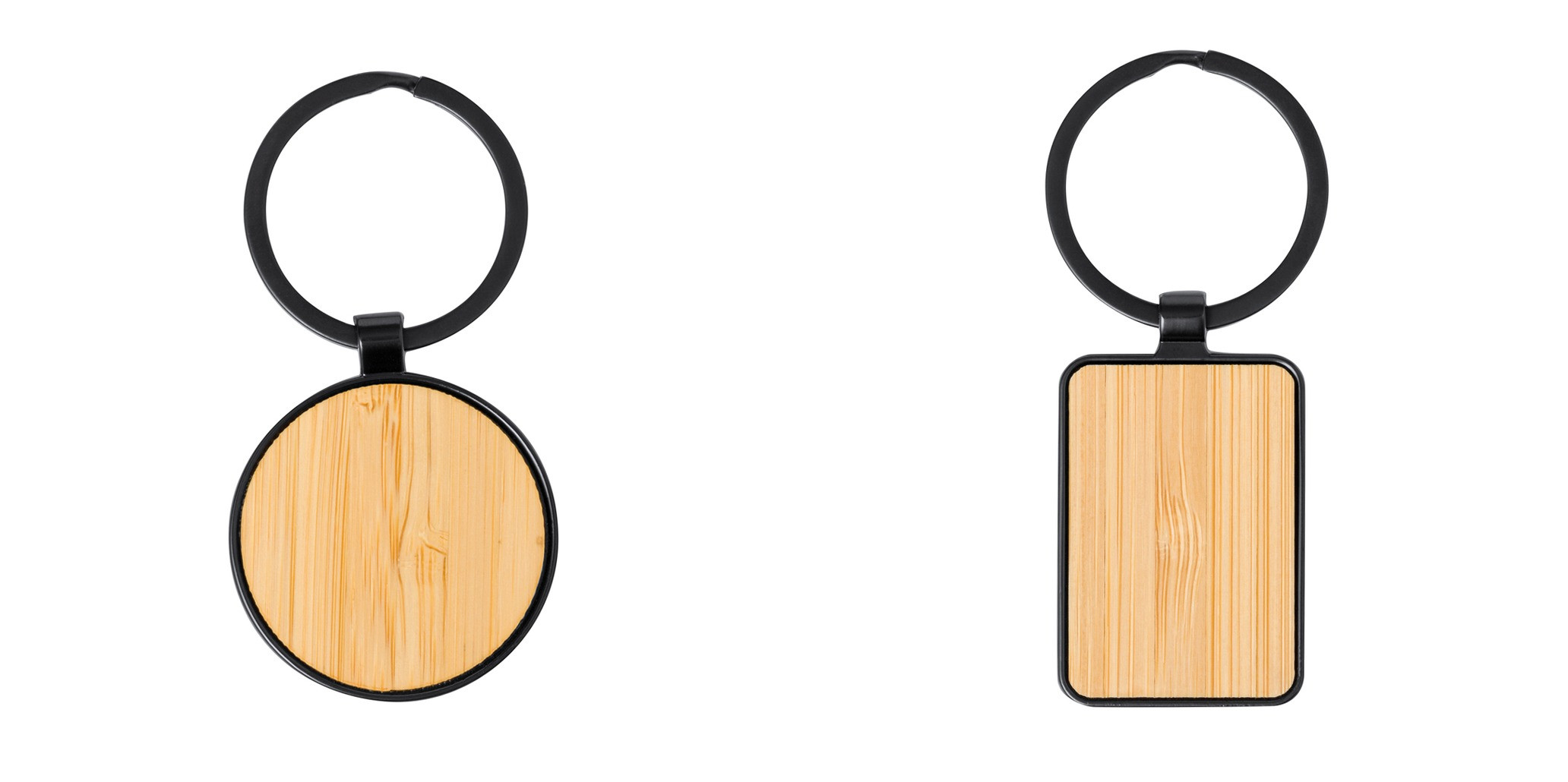 Llavero de elegante diseño, fabricado en metal pulido de color negro, con una cara en suave bambú. Especialmente diseñado par marcaje en láser y disponible en diseño rectangular y circular. Presentado individualmente bolsa de papel reciclado.