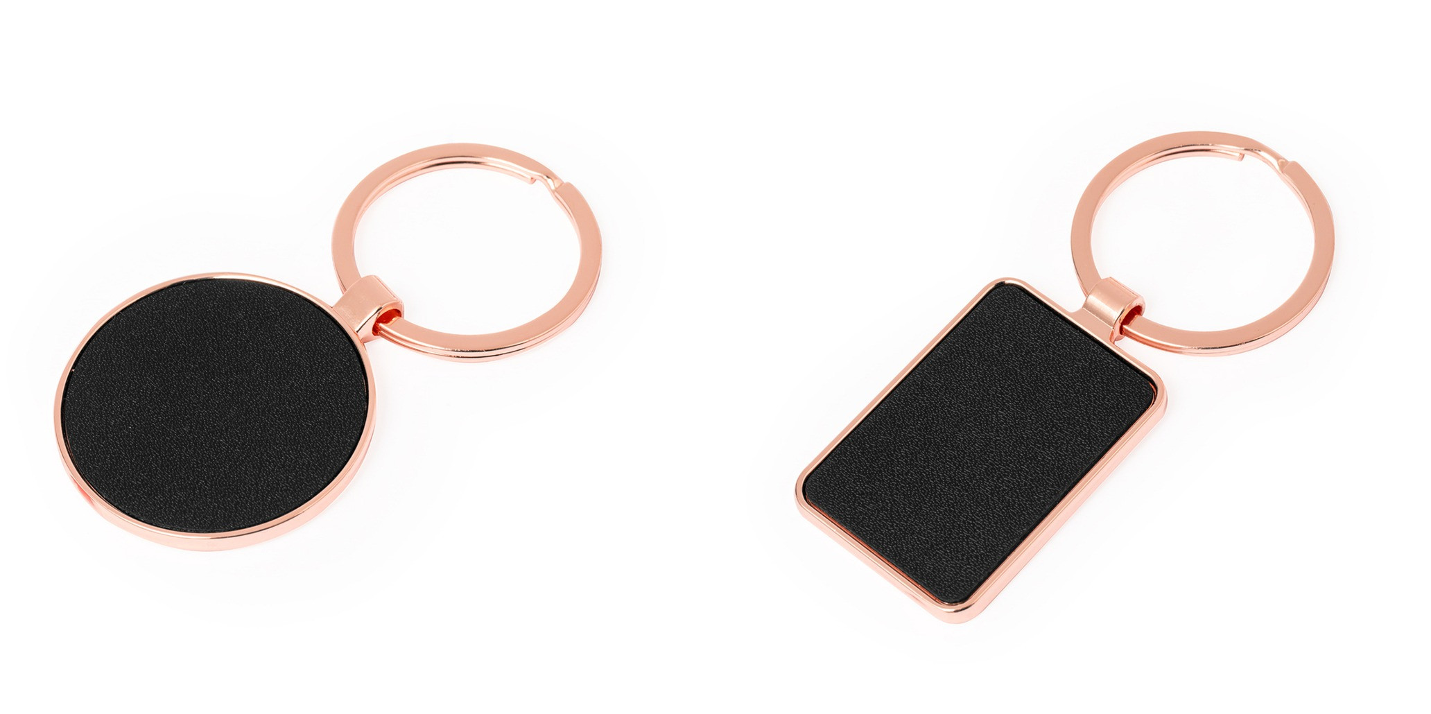 Llavero metálico de sofisticado diseño, con recubrimiento de cobre galvanizado y acabado brillo. Forrado en elegante polipiel en una de sus caras y disponible en diseño rectangular y circular. Presentado individualmente bolsa de papel reciclado.