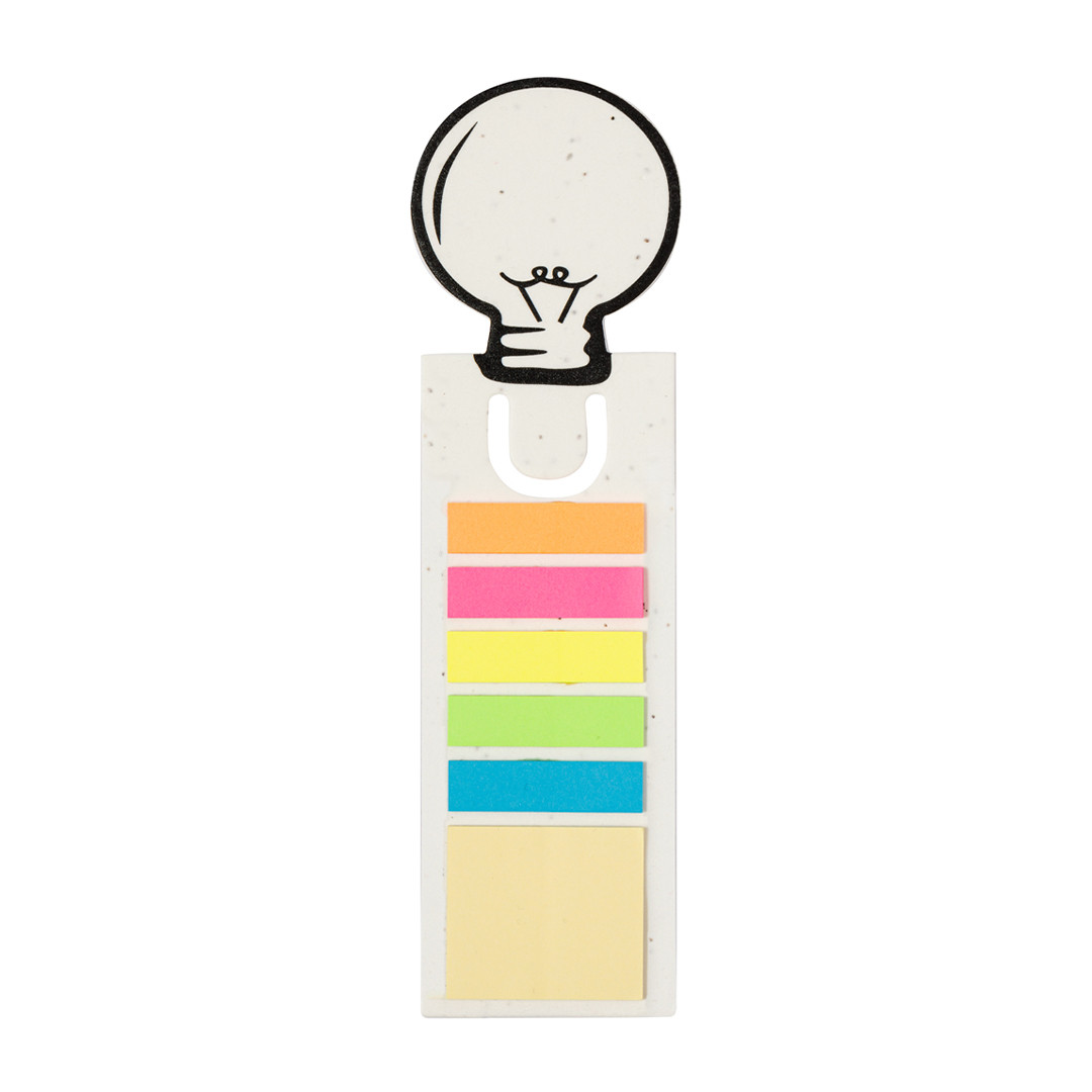 Original marcapáginas fabricado en papel con semillas, con un diseño distintivo de bombilla en la parte superior. Además, cuenta con notas adhesivas en diversas formas y colores: 15 notas adhesivas de 4x4,5 cm en tono amarillo y 75 mininotas de 1,2x4,5 cm en cinco colores diferentes. El papel incluye semillas de petunia, convirtiéndolo en papel plantable al final de su vida útil. Incluye instrucciones de plantado en la cubierta trasera y se presenta en una bolsa individual de papel reciclado.
