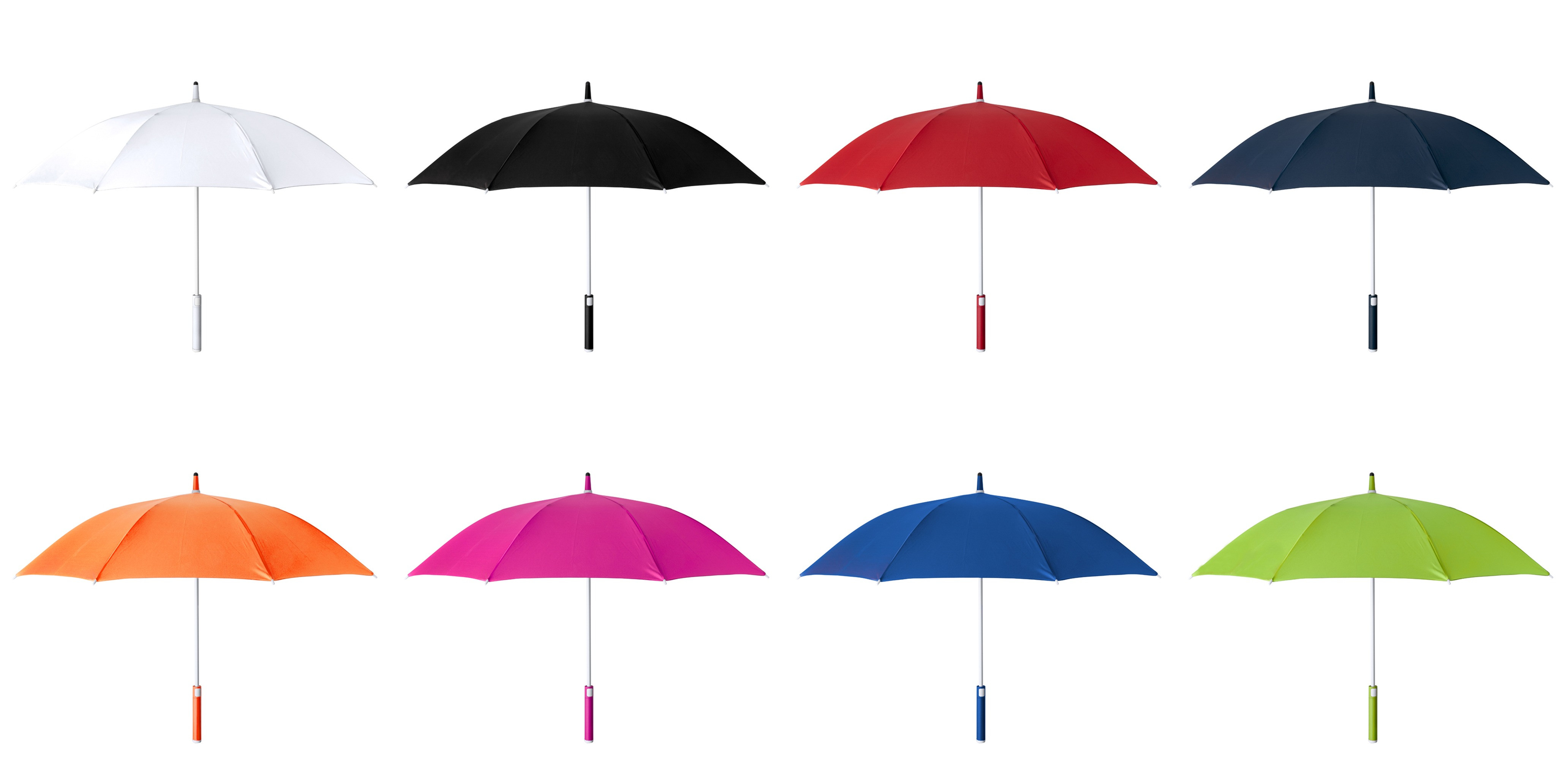 Paraguas de 105cm de diámetro en material poliéster 190T RPET. Apertura automática y varillas de fibra de vidrio antiviento, en variedad de alegres colores en cierre de velcro. Mango recto y caña en suave ABS de tacto gomoso, con etiqueta distintiva RPET.