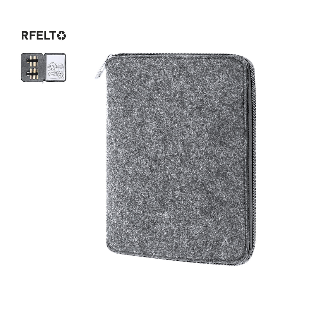 Set de lápices de colores en estuche fabricado en Fieltro RPET. Incluye 11 lápices en diferentes colores de forma hexagonal, 1 goma de borrar, 1 sacapuntas de madera y 60 hojas con divertidos diseños en blanco y negro para colorear. Presentado en un práctico estuche con cierre de cremallera en color bitono e interior con bandas elásticas para organizar los accesorios. Con distintivo de RPET.