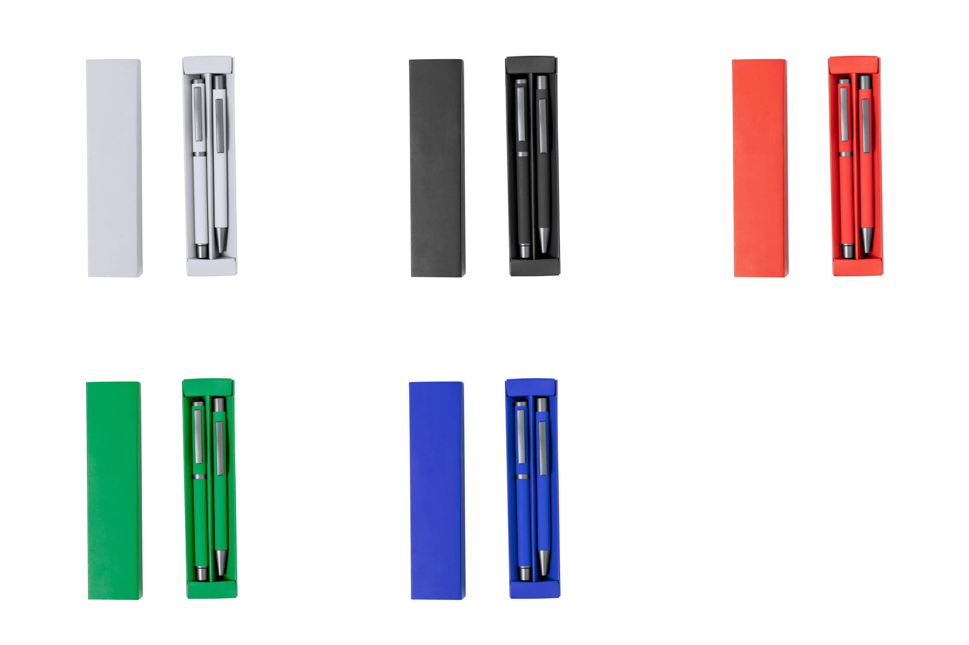 Elegante set de bolígrafo y roller. Bolígrafo de mecanismo pulsador y roller con capucha, ambos con clip metálico, carga jumbo y de tinta azul. Cuerpo en variados colores sólidos acabado goma y detalles metálicos en gris oscuro. Presentados en una caja de variados colores a juego con compartimentos interioriores separados.