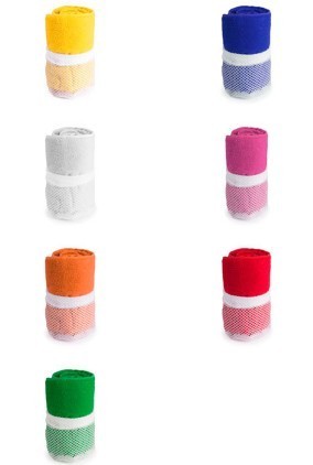 Toalla de 100x50cm en absorbente y suave microfibra de 185g/m2 en variados colores. Presentada en práctica bolsa de transporte de redecilla con accesorio de ajuste.