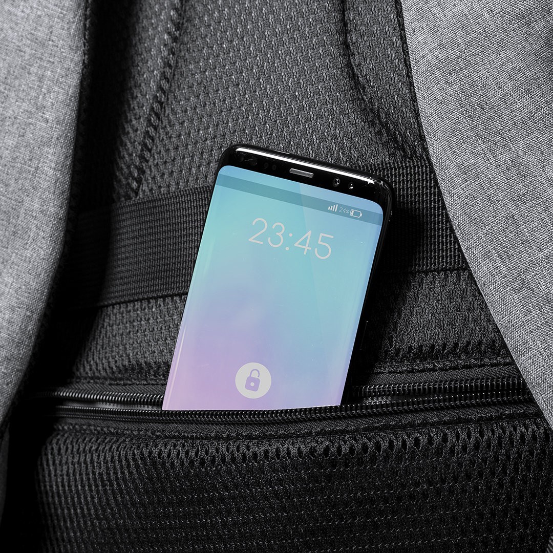 Mochila de negocios antirrobo de línea nature y en resistente 600D RPET efecto melange, elaborado a partir de plástico reciclado para así fomentar la reutilización de residuos plásticos y contribuir a la sostenibilidad del planeta.